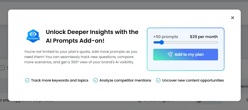 - Your Quota: Your plan includes a specific number of AI Prompts (e.g., 15, 25, 50…).