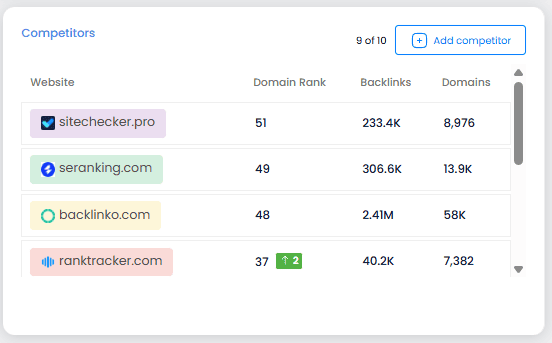Finally, before we get to the main table, we have the Competitors block. Here, we display the rivals you’ve added to your project along with a summary of their backlink stats.
