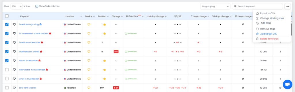 You can select as many keywords as you want from the main list, click the Actions menu, and select “Add target URL”. This is perfect when you have a cluster of keywords that all should go to the same landing page.