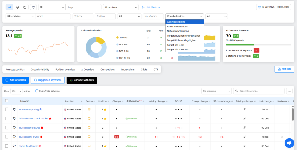This is where TrueRanker shines. To know if a cannibalization is “Bad” or “Good,” the system needs to know which URL you actually WANT to rank.