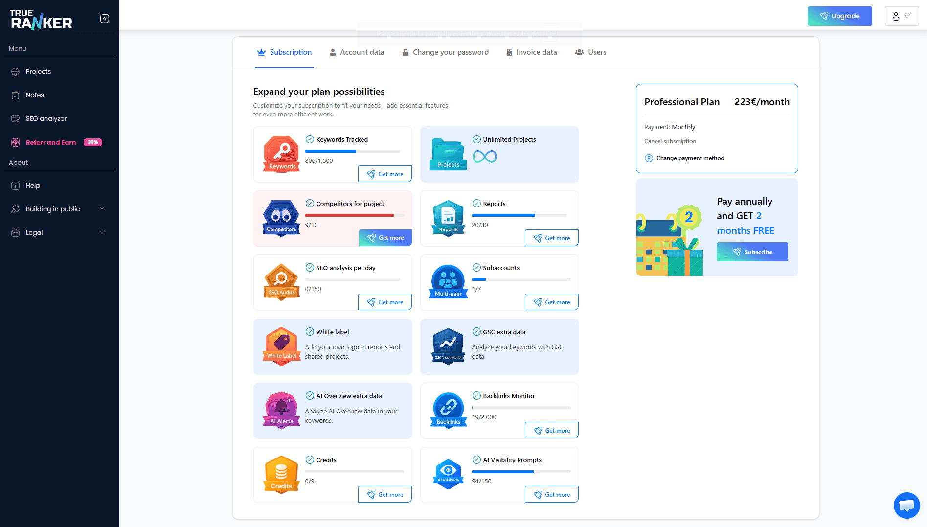 - Check your usage: Visually track your limits for keywords, projects, reports, and SEO audits in real-time.