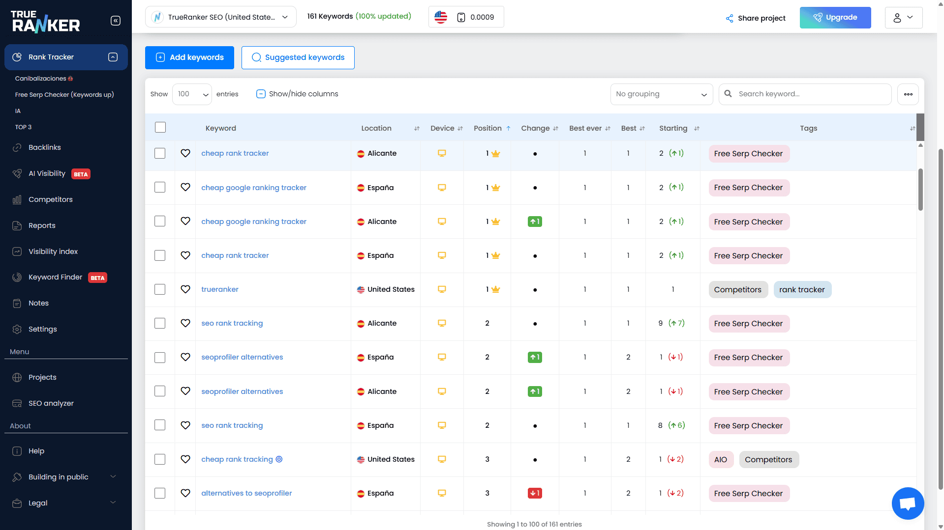 Un error común es trackear las keywords por separado. Con TrueRanker, puedes usar el sistema de Etiquetas (Tags) para agrupar todas las keywords de un mismo cluster.