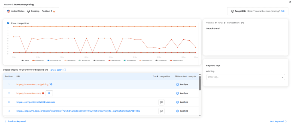 - En la vista de detalle, mira la tabla «Google’s top 10 for your keyword».