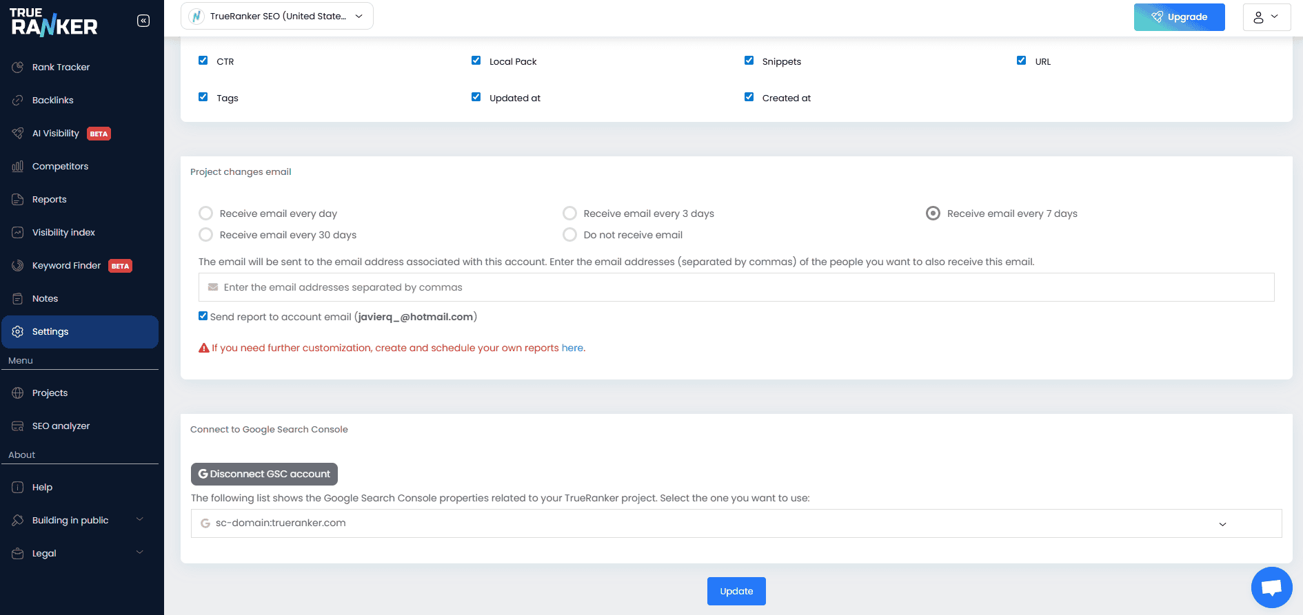 - Desconectar: Haz clic en el botón «Disconnect GSC account» para eliminar la integración al instante.