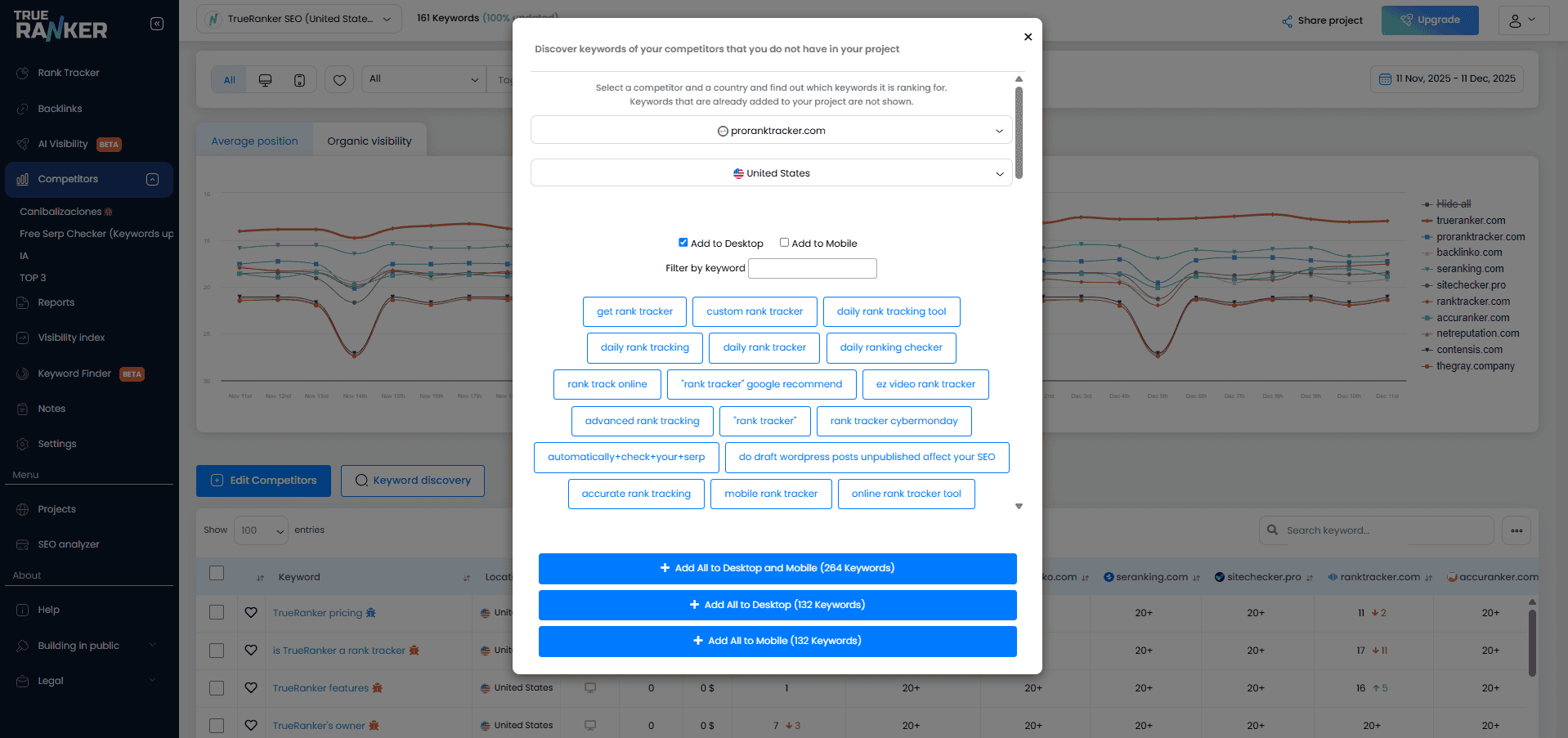 Yes! This is one of our most powerful features. In the “Competitors” tab, use the Keyword Discovery tool. Select a competitor domain, and we will show you a gap analysis: the high-value keywords driving traffic to them that are missing from your project.